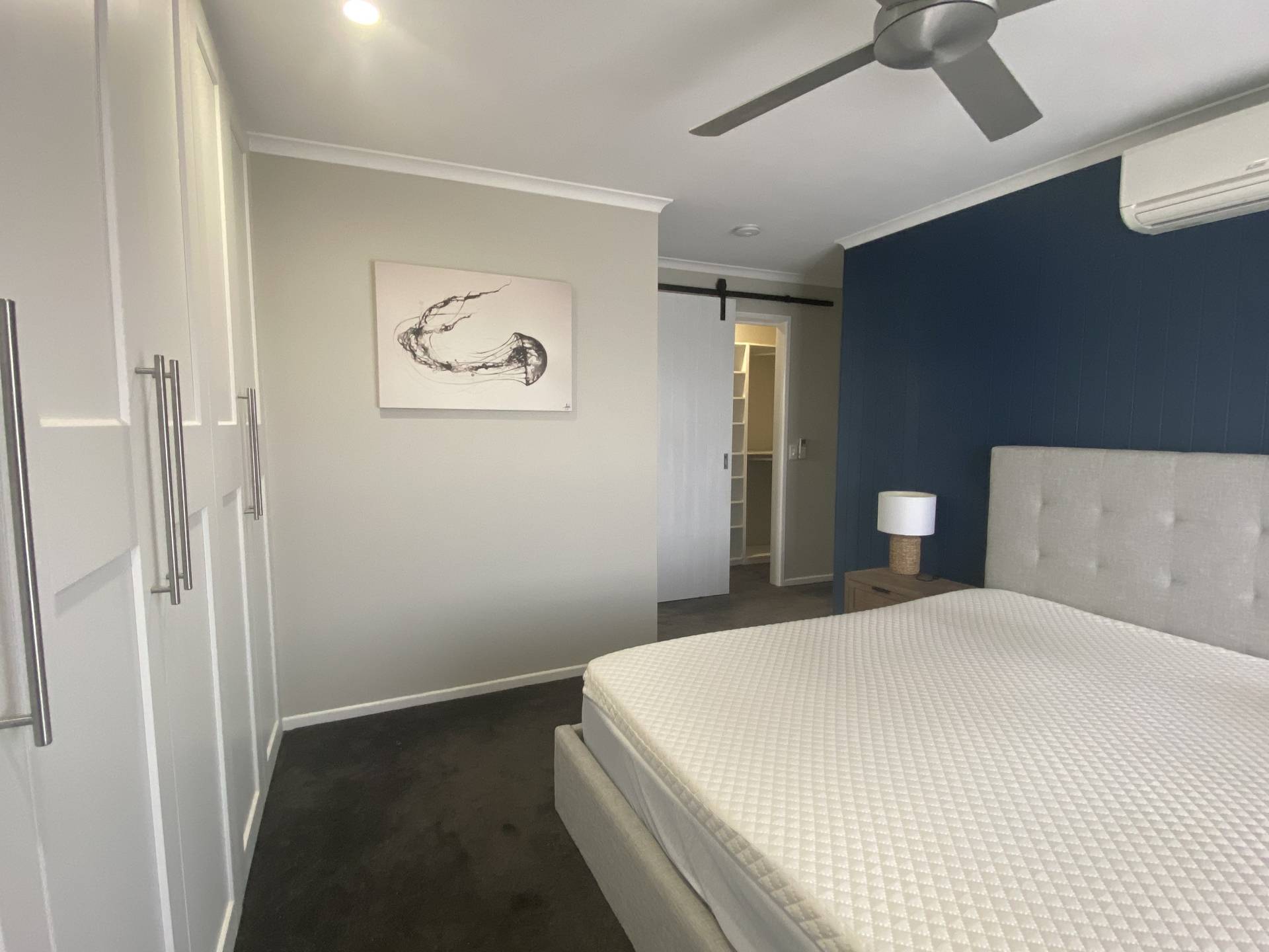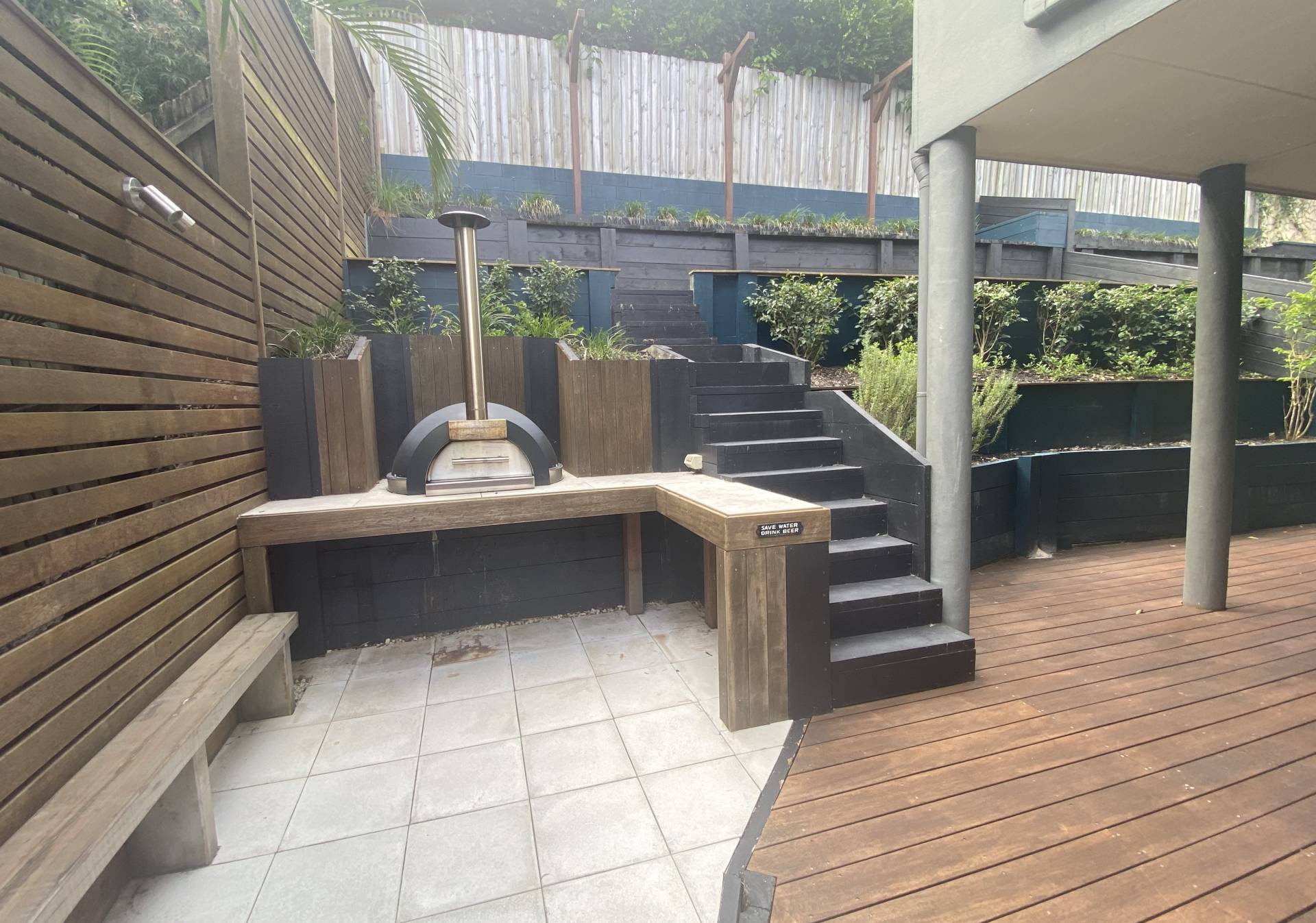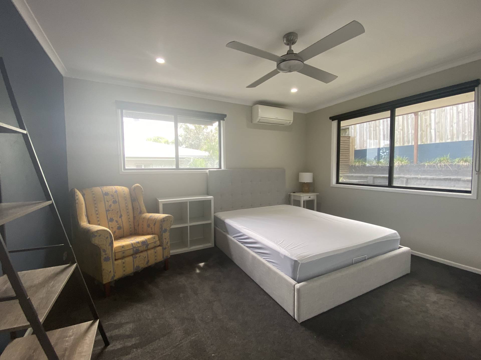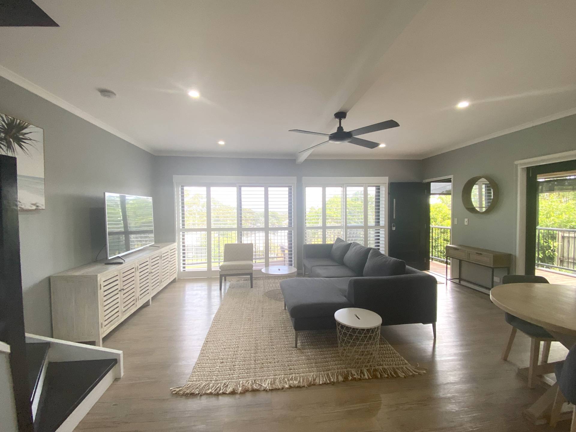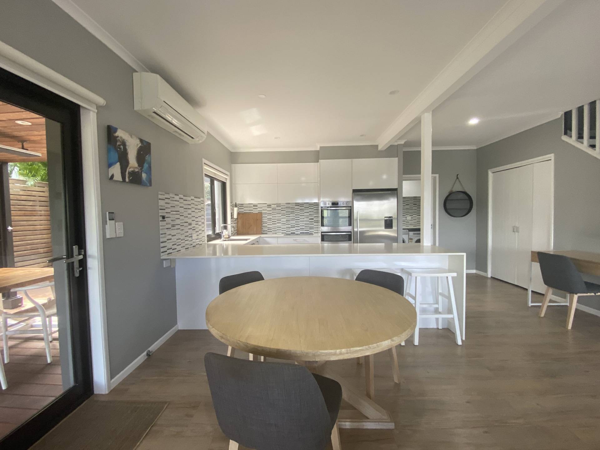 Set over 2 levels,  the tastefully furnished open plan living, dining and kitchen are on the first level with both a balcony at the front looking out towards Mount Cooroy, and a covered entertaining area at the side. There are plenty of spots to relax and take in a cuppa or glass of vino, especially as the gardening is included in the rent!  Wood-fired pizza oven, breakfast bar opening through to the kitchen and alfresco strip heaters are just some of the outdoor perks.  Did we mention the view?