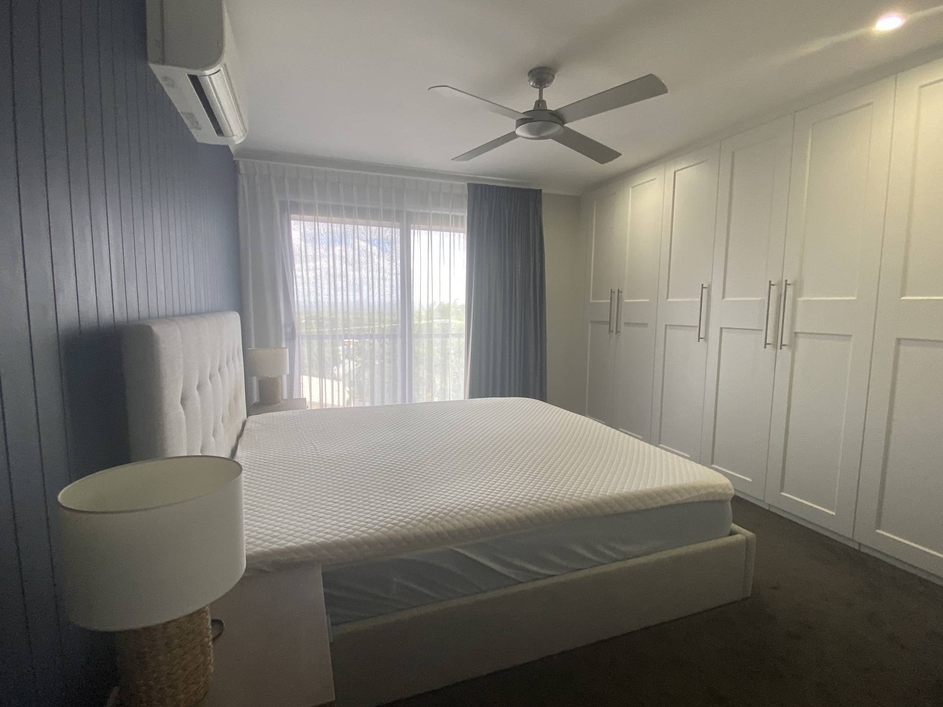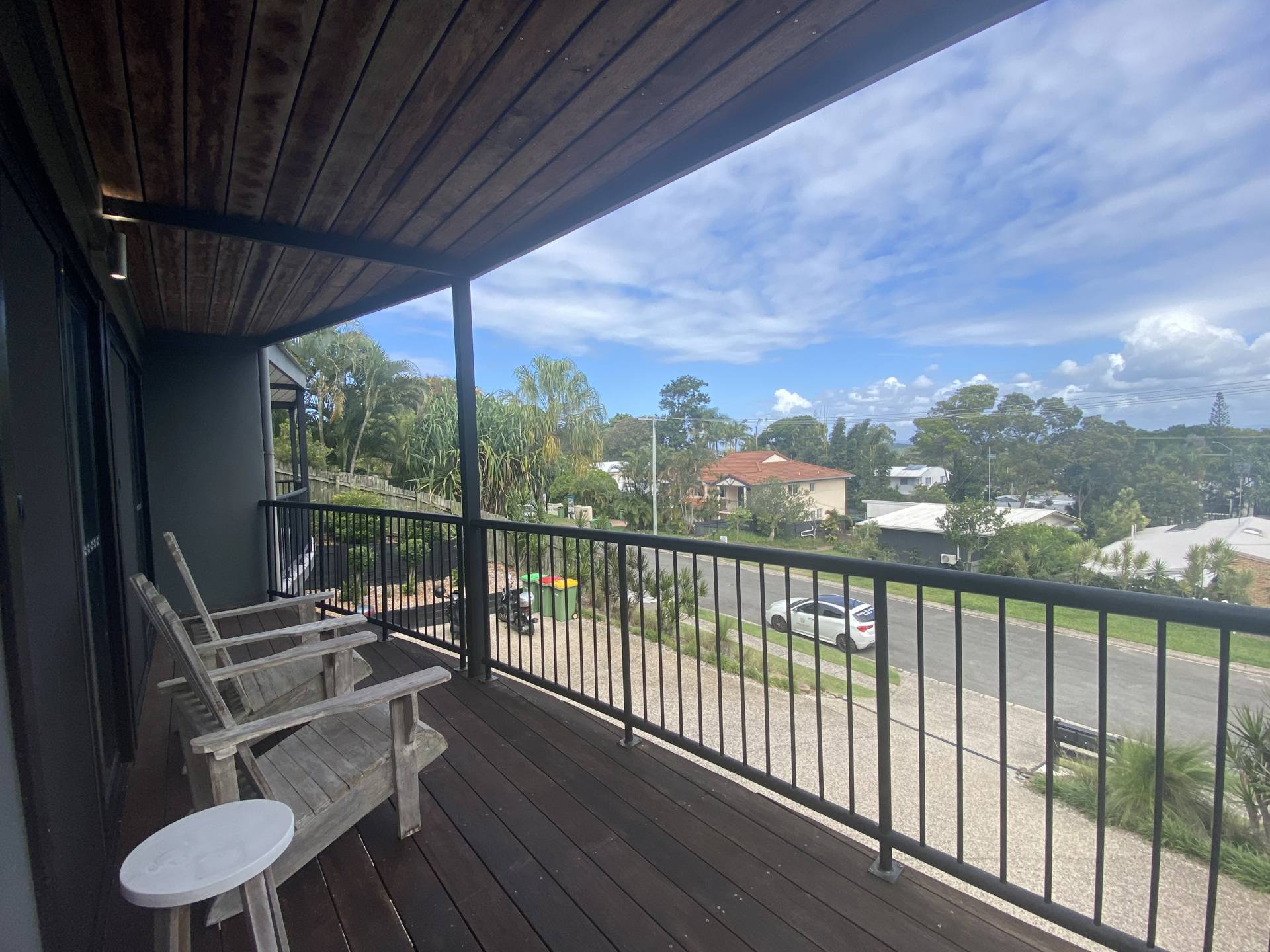 Upstairs offers 3 bedrooms and two bathrooms - the master bedroom with lovely ensuite and walk in robe plus additional floor to ceiling cupboards.  All bedrooms have carpets, built-in cupboards and fans, and the master bedroom and one of the other bedrooms have reverse cycle air-conditioners. The main bathroom has a shower, freestanding bath and toilet.  A second balcony on this level also has views across to the hinterland.  Beds are King in the master bedroom and Queen and Single with trundle in the other two bedrooms.