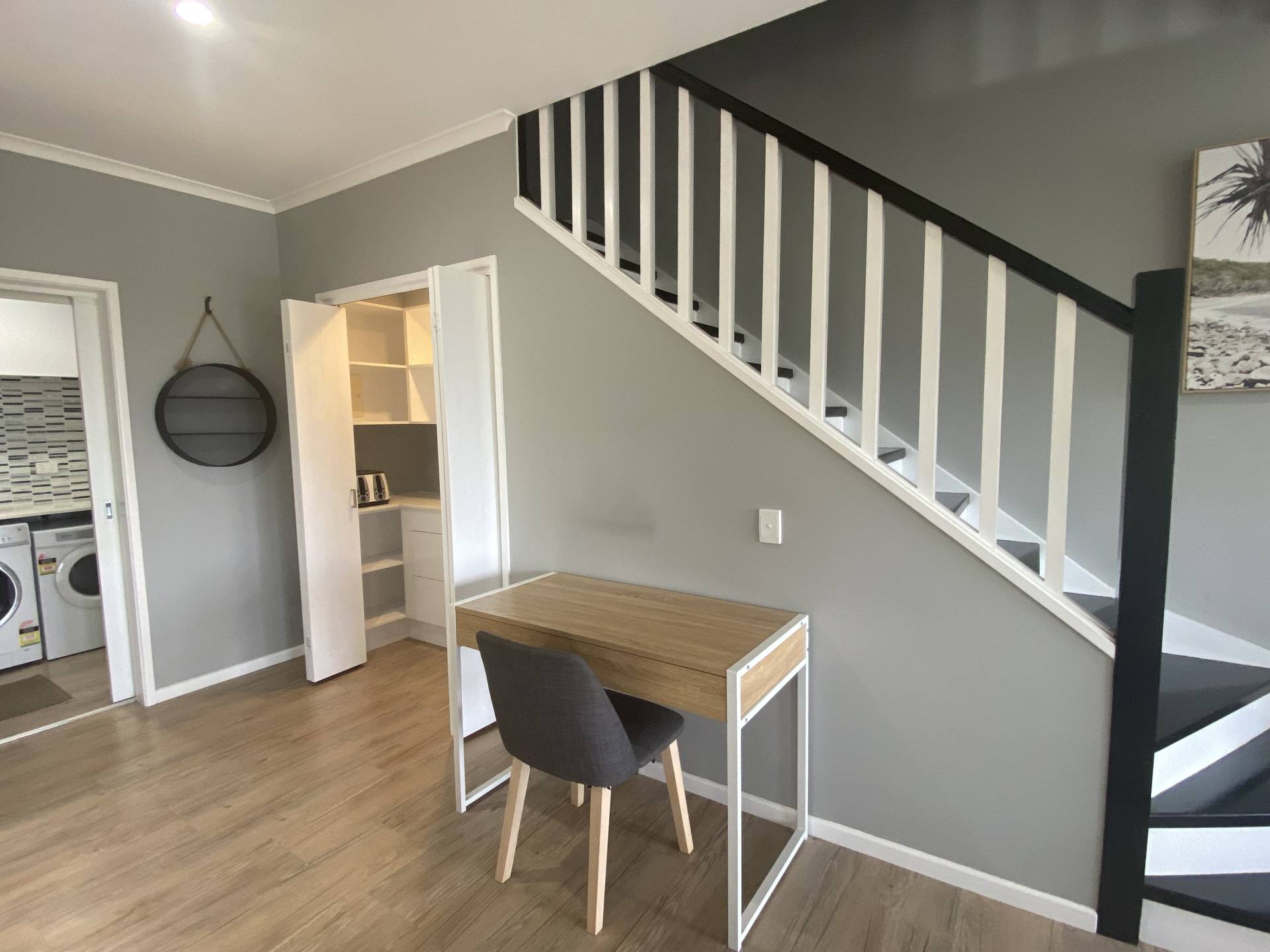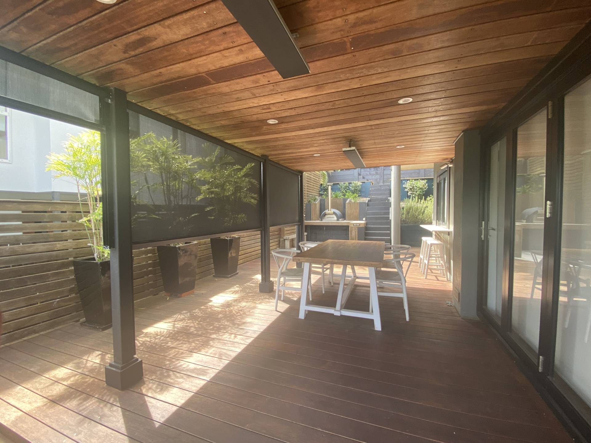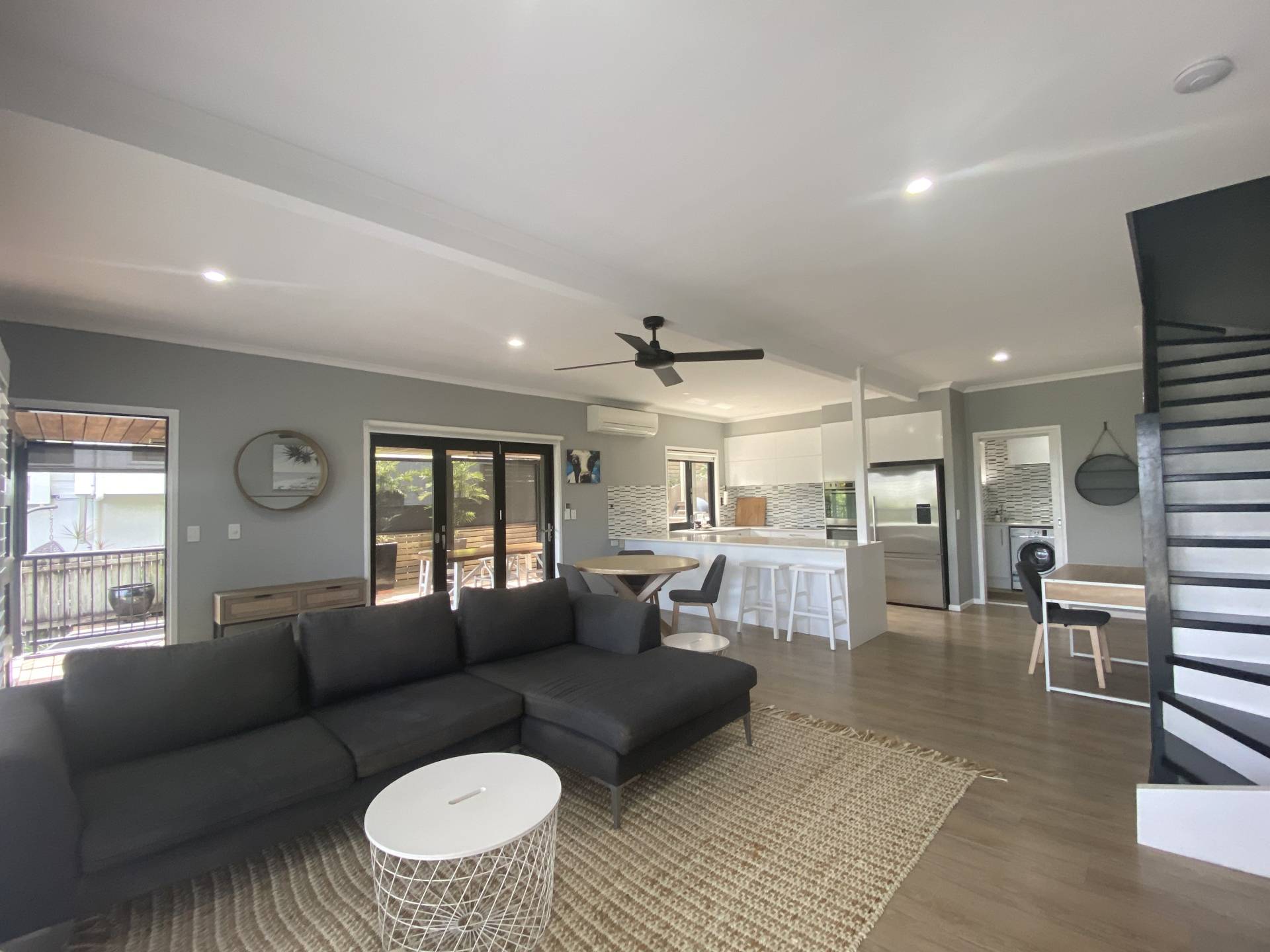 The air-conditioned living area is private with plantation shutters to the front and roller blinds to the doors and windows that open out to the side entertaining area.   The kitchen has ample counter and storage space, and includes stone bench tops, a dishwasher, oven and stove top. Also on this level is the internal laundry and powder room, study nook and under stair butler pantry.