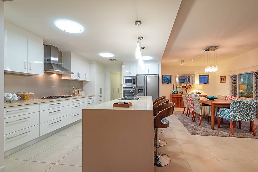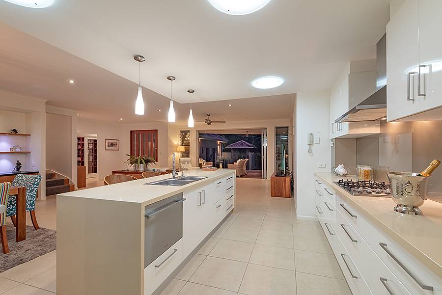 The open plan living, dining and kitchen are designed on a grand scale, with seamless indoor outdoor integration with the front patio overlooking the pool. The kitchen has stone bench tops, a large island bench/breakfast bar, gas cooking, single drawer dishwasher in the island bench plus a full dishwasher in the adjacent butler's pantry! Enough to delight even the most fastidious of chefs...  Fridge, washing machine and dryer are provided.