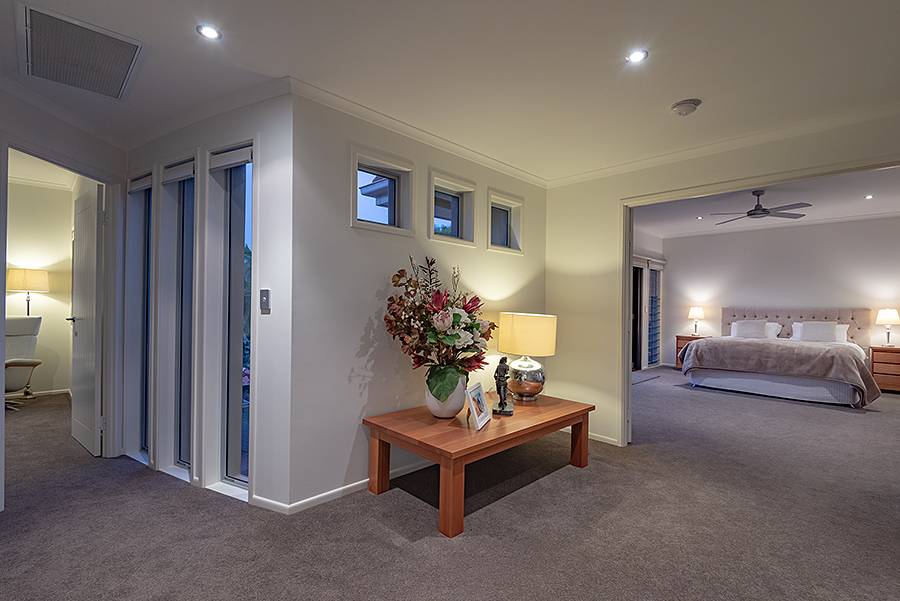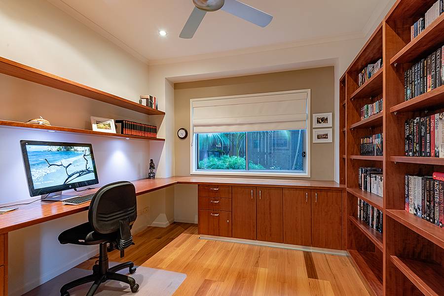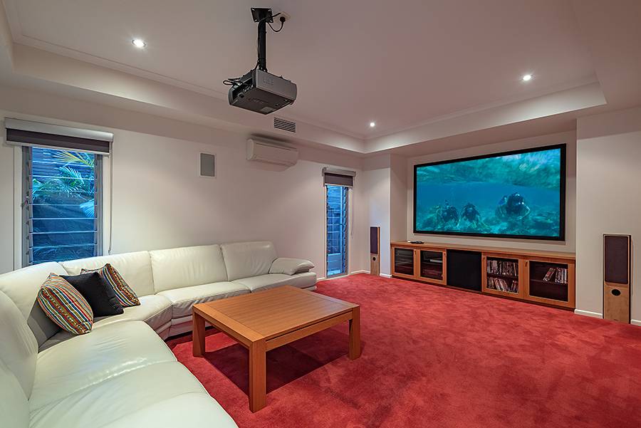 Also on the lower level are a large study with built-in timber shelving, wide workstation and storage, as well as an exceptionally spacious media room (red carpet has been updated since photos were taken to match the rest of the home). Guest accommodation is on offer with a large bedroom with double walk in robes,  serviced by the two-way bathroom/powder room.