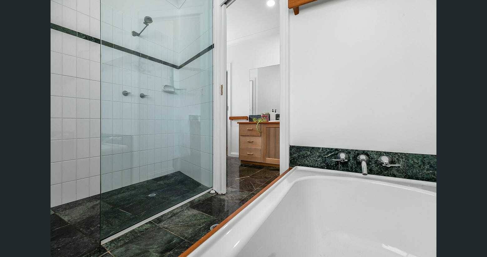 On the same level as the main house is the granny flat/separate wing. This can be separated and closed off from the main house by closing the door between the two living rooms, or can be left open to incorporate it into the rest of the house.  There is an open plan living room with kitchenette, 3rd bathroom and a further two bedrooms. The living room and one bedroom also have doors out on to the verandahs.  If closed off from the rest of the house, there is a separate entrance to the flat via the kitchenette.