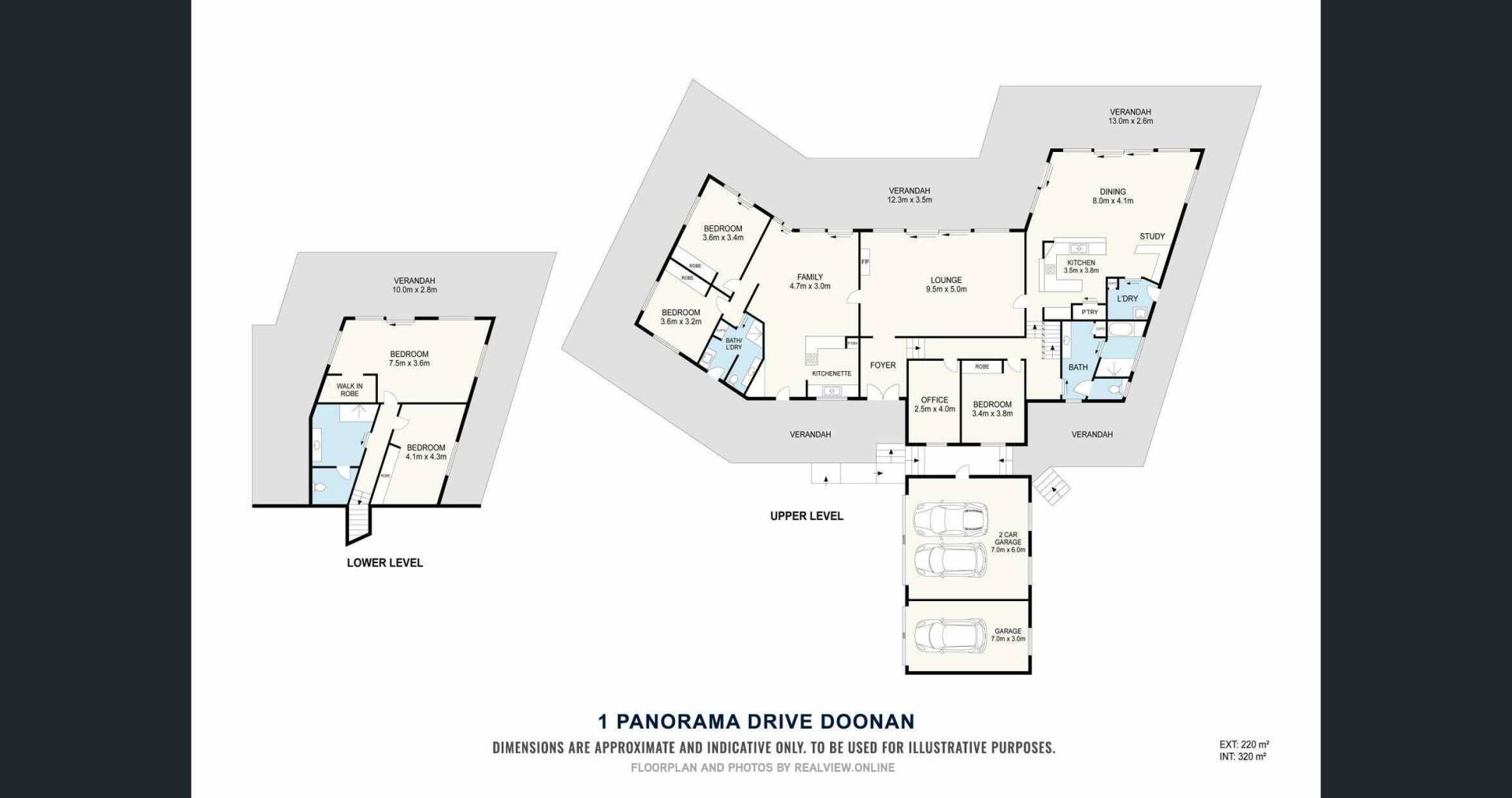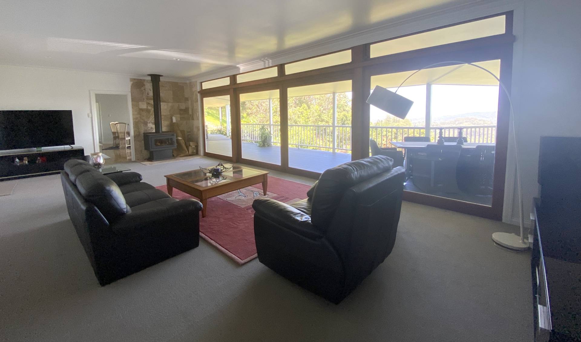 The main house and granny flat are on one level under the same roofline and share the extensive covered verandahs.  Upon entry to the home is the large living room with massive glass sliding doors out to the verandah and the view.  Adjacent is the separate open plan family room with kitchen, dining and study nook, plus access to the laundry.  On the next level down from the living area is the study and one bedroom and bathroom, with the other two bedrooms and second bathroom being on the floor level below that.  The larger room downstairs has sliding doors out to the bottom patio which also shares the magnificent views.