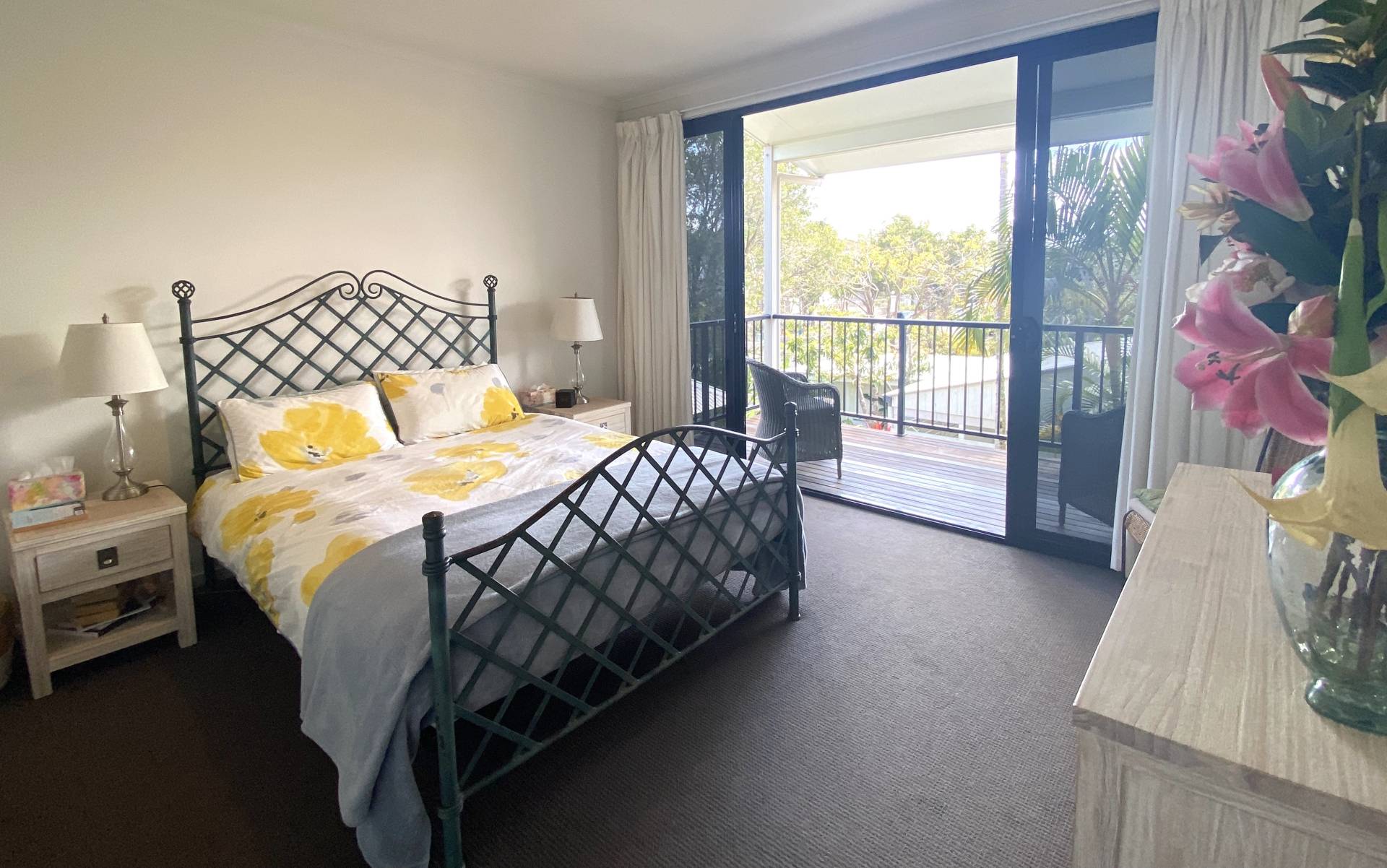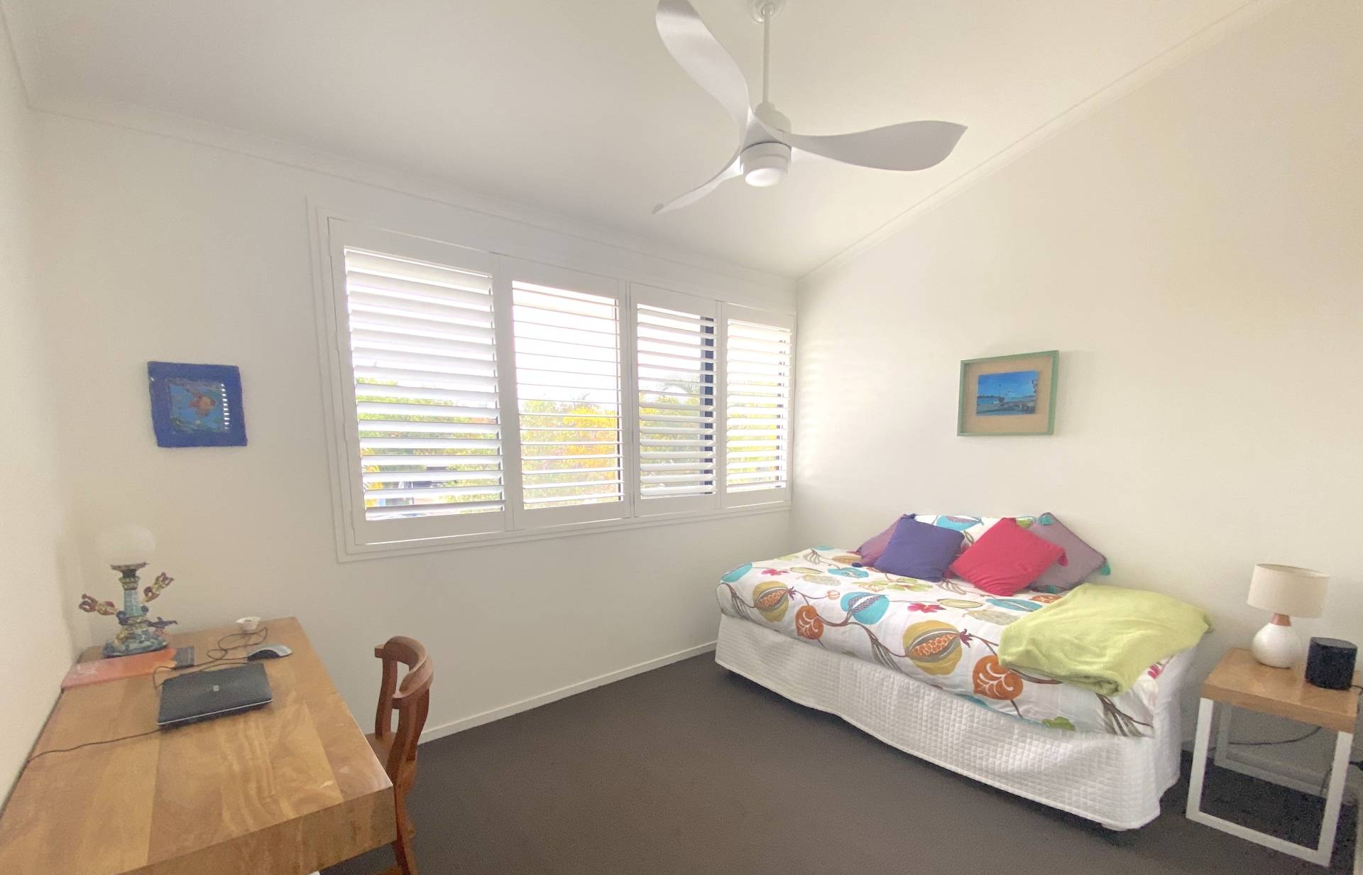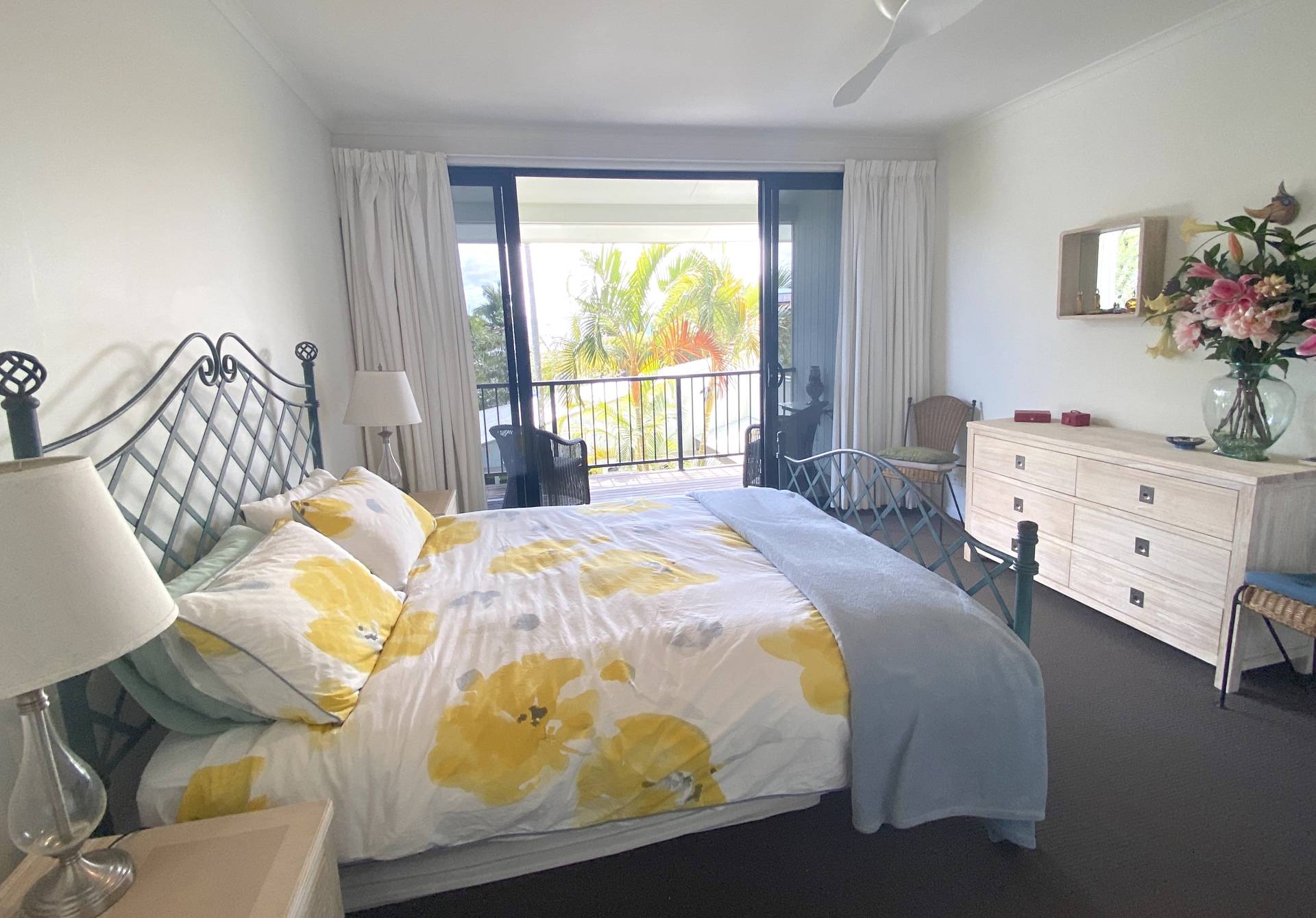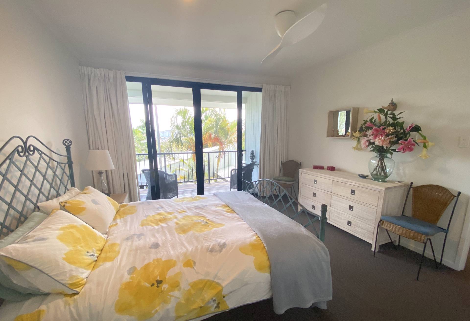 Upstairs the master bedroom has a Queen bed, its own private balcony and a good sized ensuite with shower.  The other 2 bedrooms have a Double bed in one room, and the other has a King Single bed with trundle. The main bathroom has a shower over the bath.  Carpets and fans in all bedrooms.  BYO linens and bedding.
