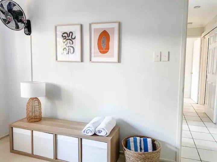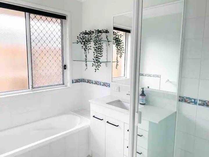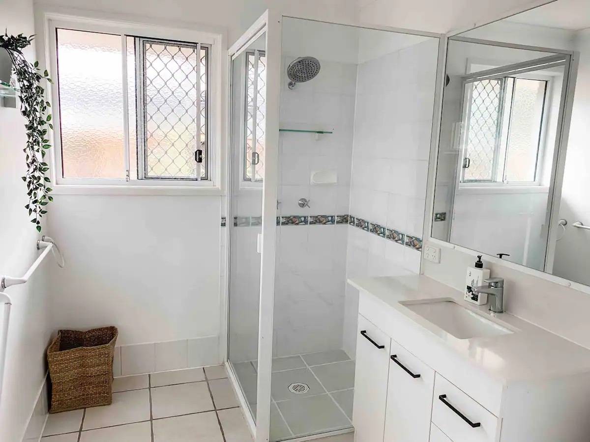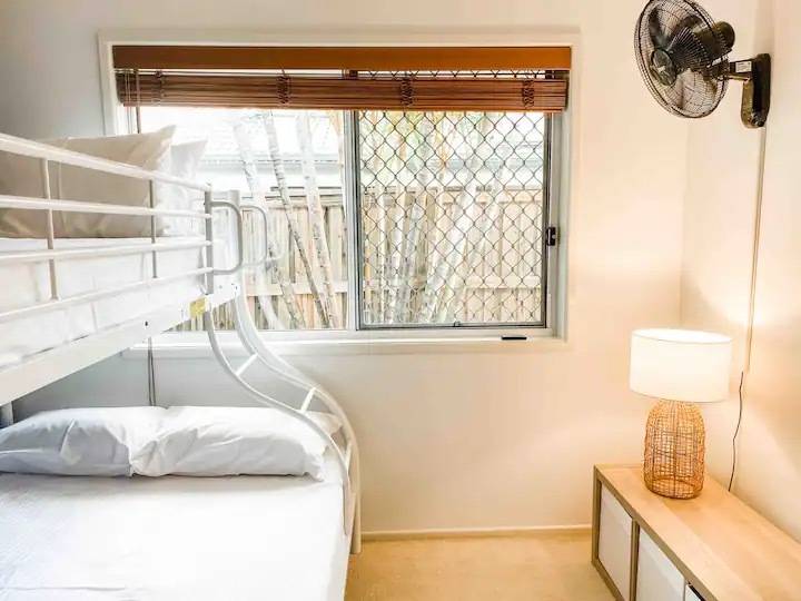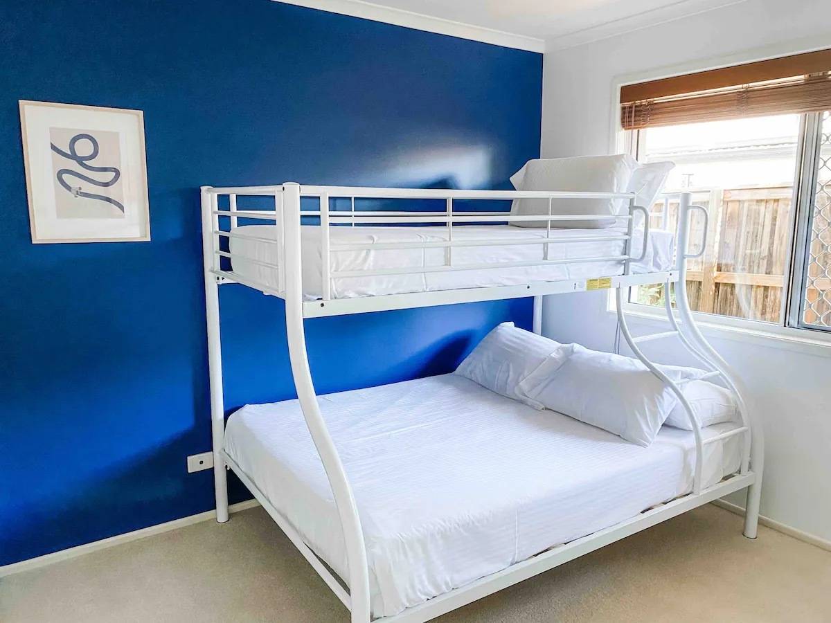 The master bedroom has a walk in robe and ensuite with shower, and the other 2 bedrooms have use of the central main bathroom with bath and shower, and separate toilet.  Master bedroom has a king bed, the other bedrooms have a queen bed and a double bunk with single bed on top.