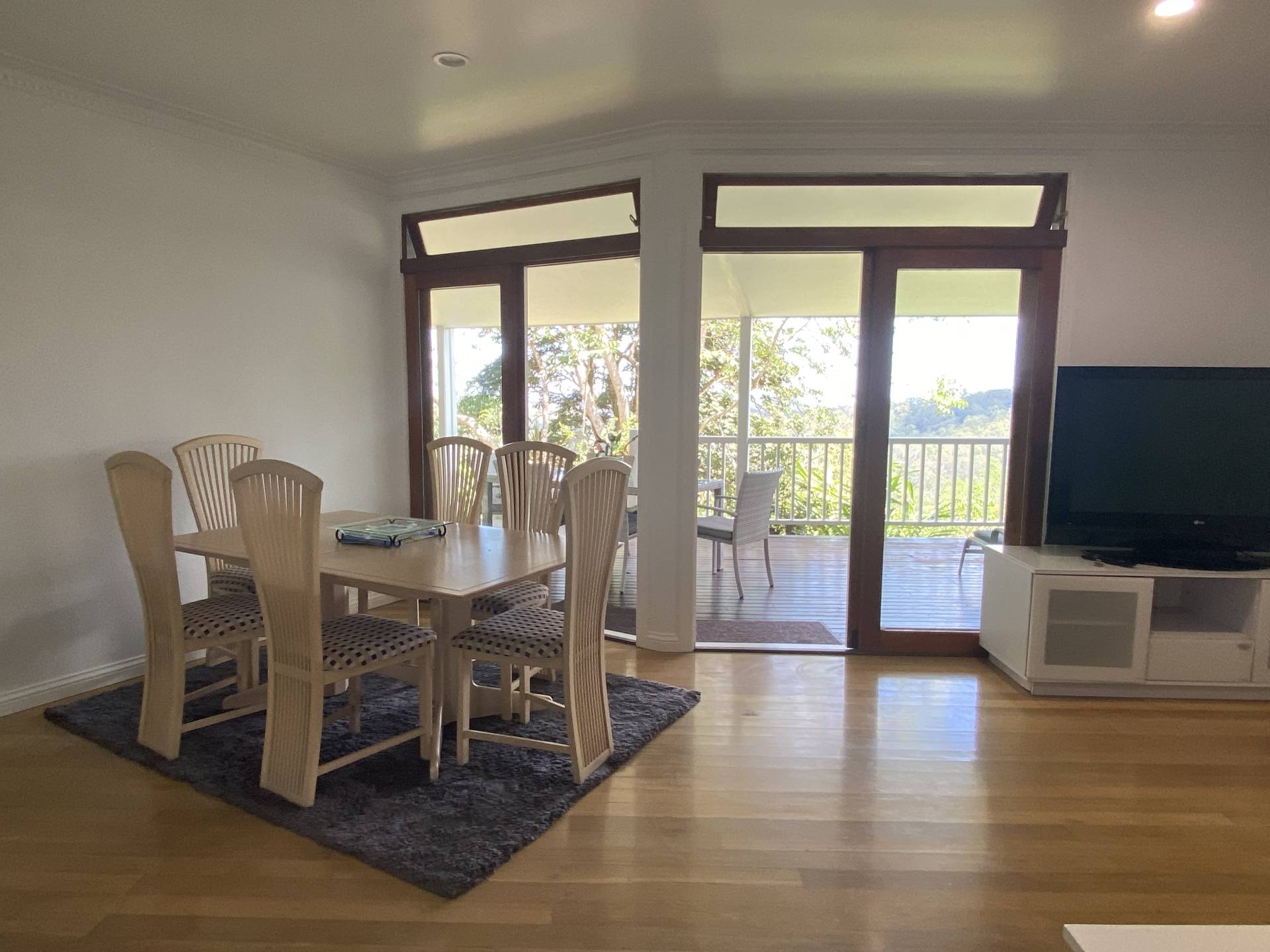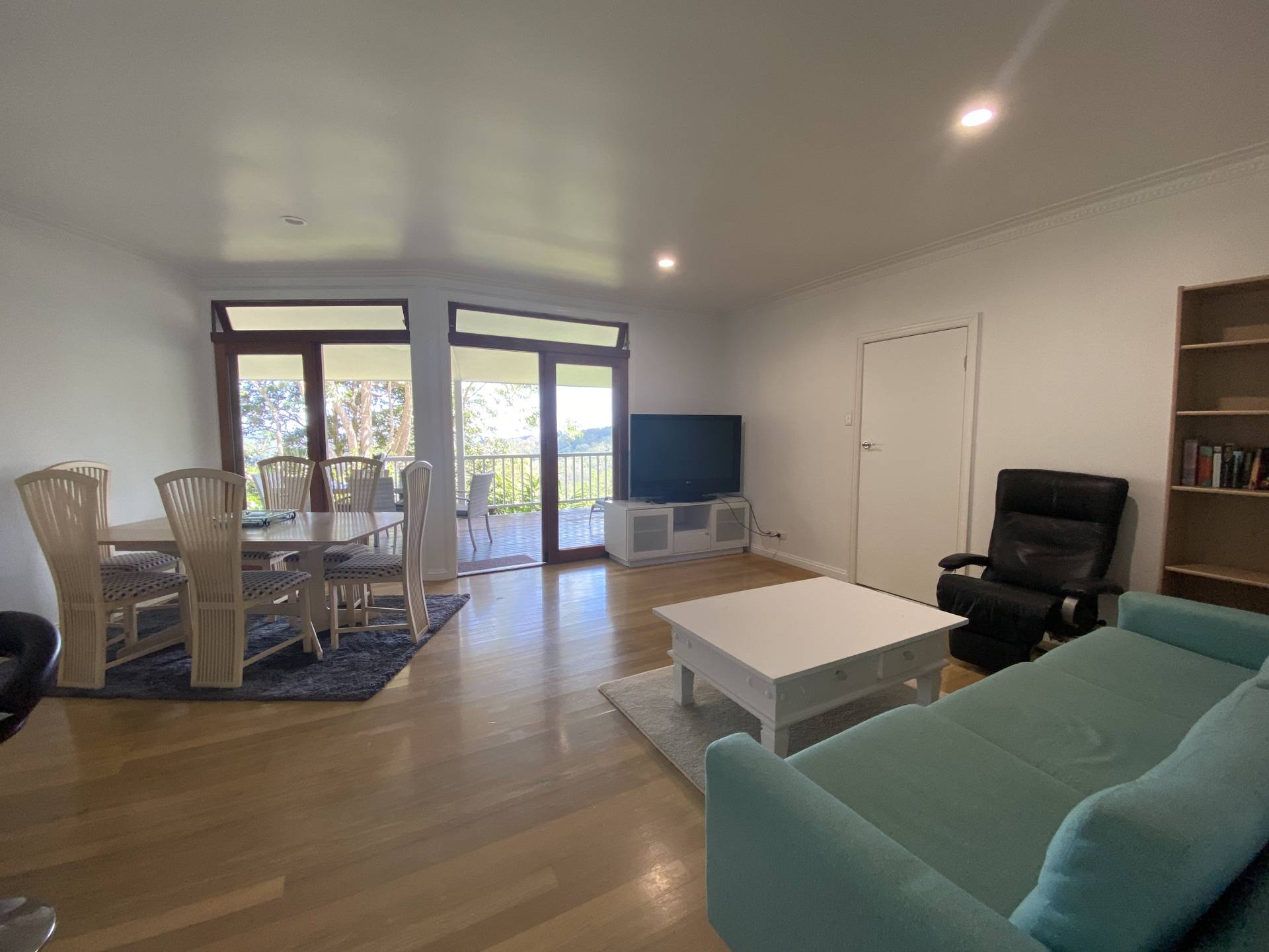 Outstanding views across the rolling greenery to the ocean will have you up with a cuppa in time to see the sunrise.   The granny flat has an open plan kitchen, living and dining with sliding doors out to the large deck looking out to the eastern beaches.  The kitchen has fridge, hot plate and oven plus good bench space and a pantry. Cutlery, crockery and pots and pans are provided.