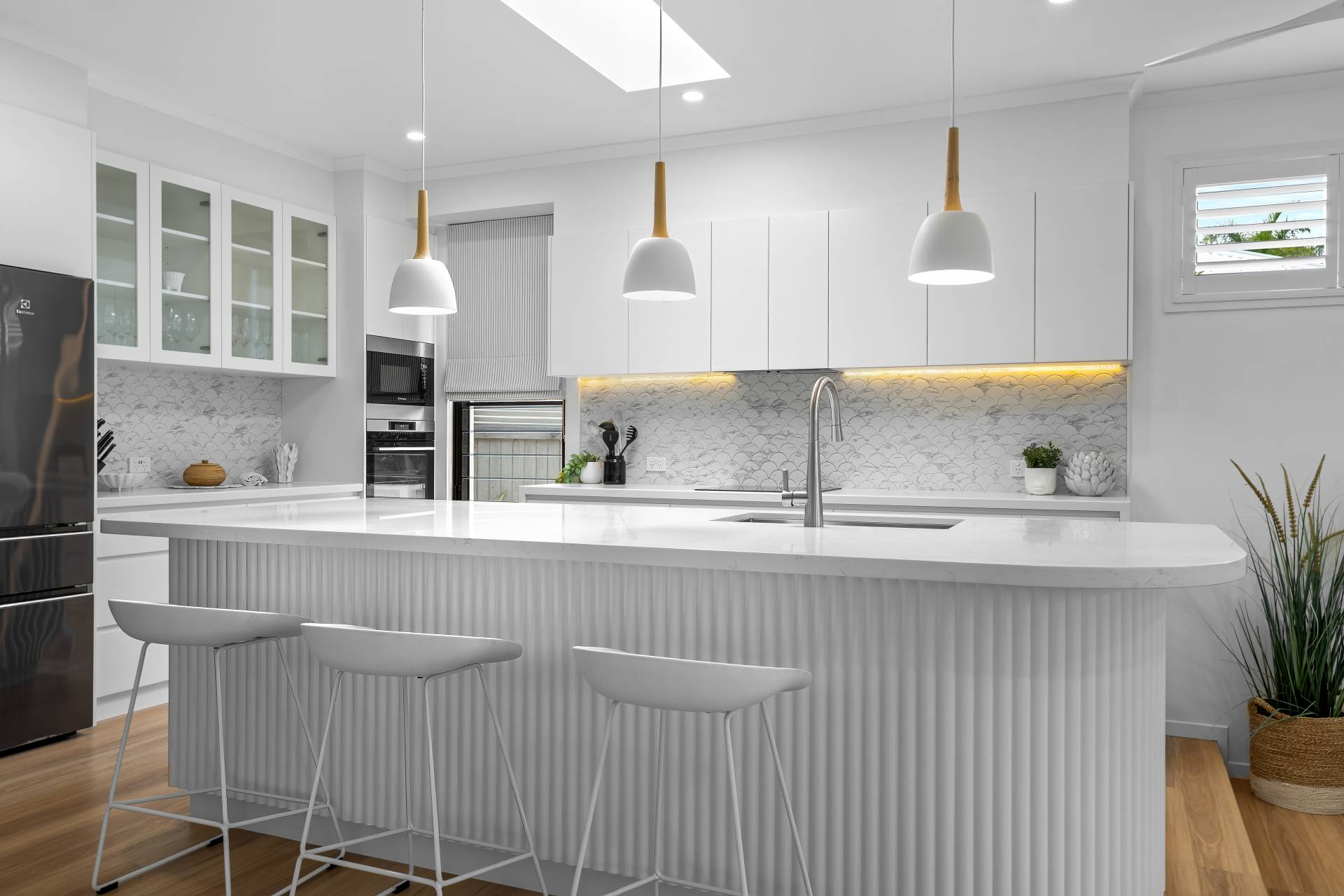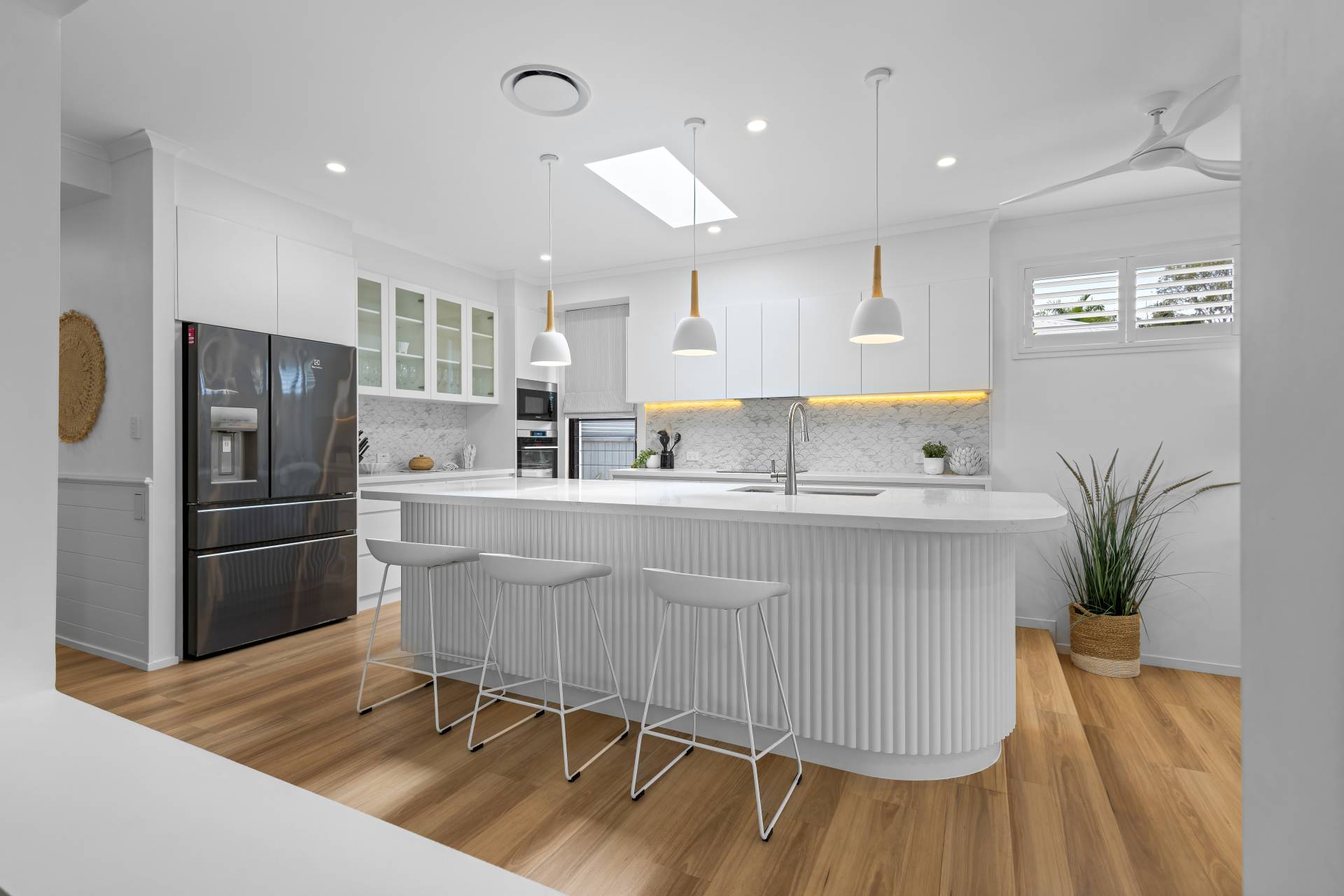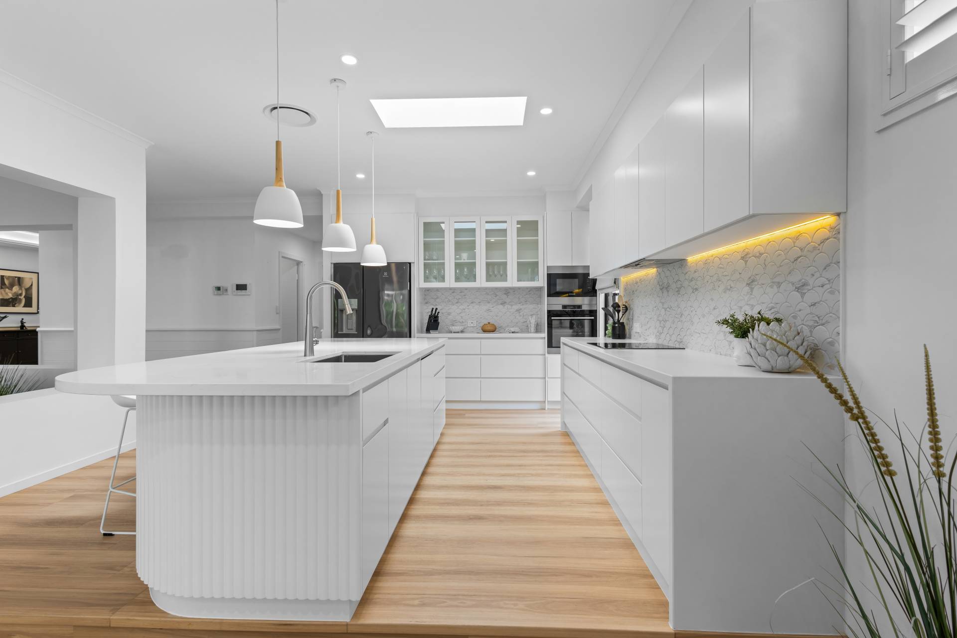 The kitchen is one of the masterpieces of the home, with beautiful splash back tiles, stone bench tops and island bench breakfast bar.  It is open to the living and dining room so the chef can put the final touches on delicious meals while still engaging with everyone around them.  Quality appliances, ice and water dispensing fridge, integrated dishwasher, and more than enough lovely crockery and glassware to suit the dinner party planner of the family.  A few steps down from the kitchen is the formal dining area which is extremely elegant and set up to entertain a party of ten.  A huge Butler's pantry is adjacent to the kitchen including wine fridge and ample storage and shelving, and the laundry is opposite the Butler's pantry.