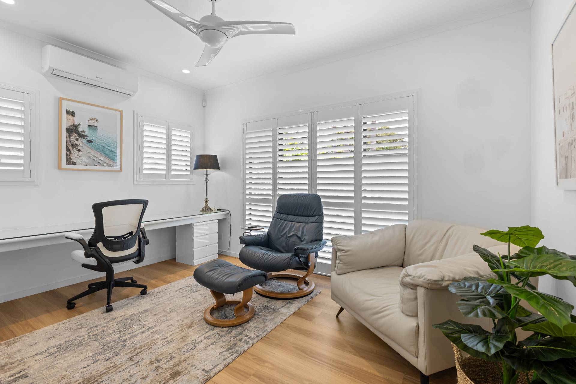 Leading off the foyer area is the study with built-in desk, television and separate air-conditioner, and the lovely guest powder room, and under stair storage.