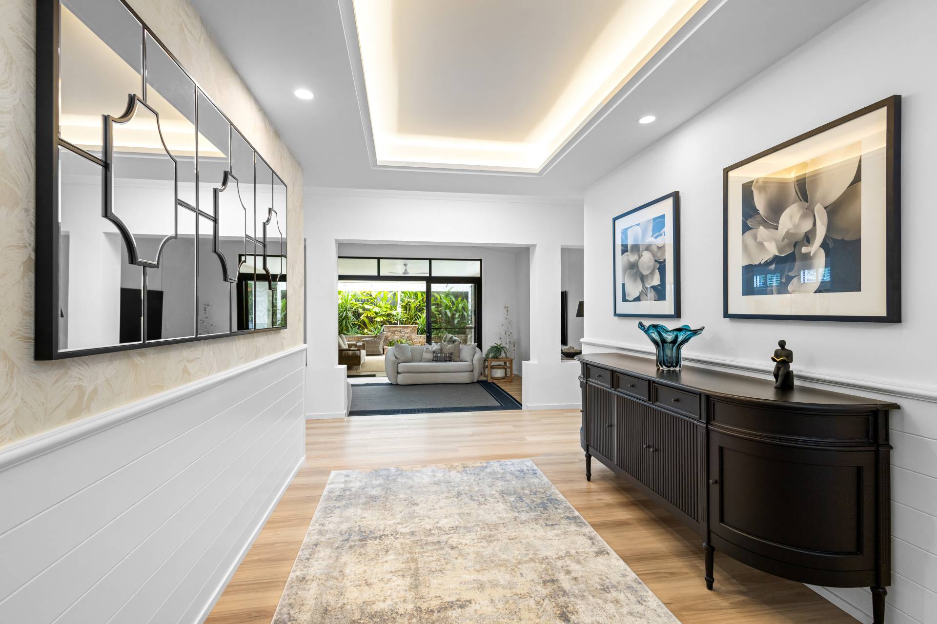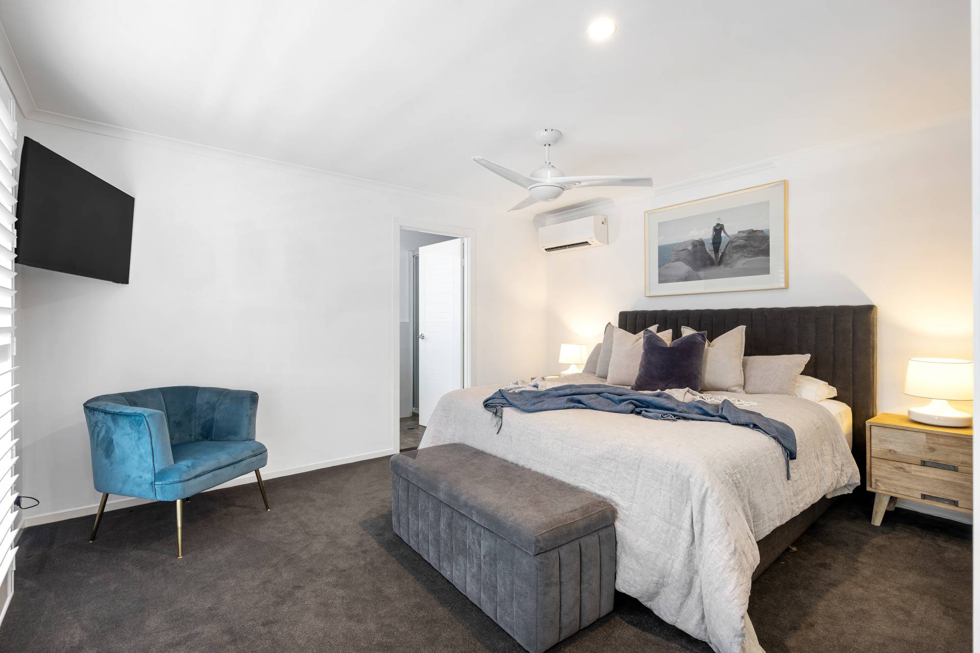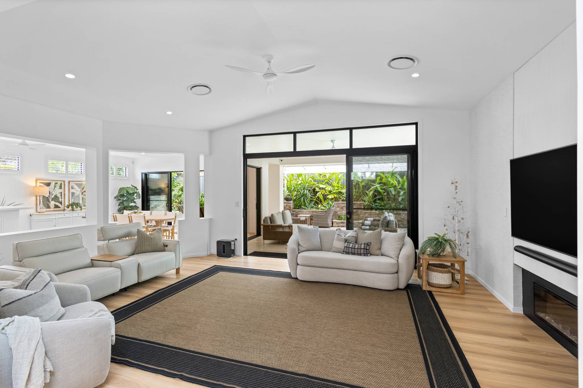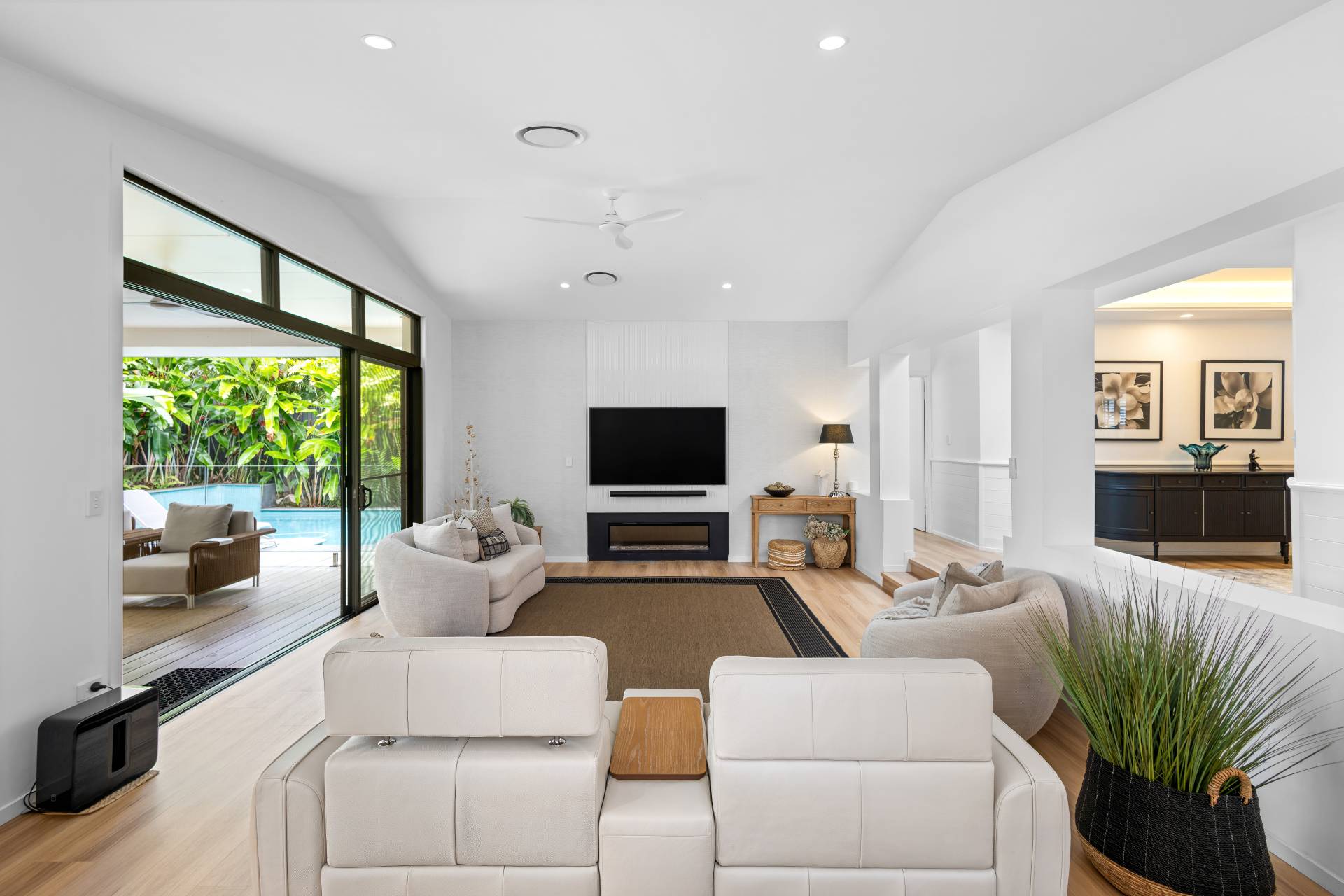 Double door entry leads you to a welcoming foyer which looks straight out across the oversize lounge to the expansive entertaining areas beyond.  The lounge has very comfortable sofas (one with electric reclining optional) to enjoy the large screen television with Sonos sound system or relax to the flicker of the flames of the built-in feature gas fireplace.  Sliding glass doors lead out to the undercover entertaining areas where you will spend most of your time.  Adjacent to the pool there are several sofas and chairs set up to mingle and chat, while outside the dining room is a large dining table and chairs where you can enjoy a feast and a cold beverage while watching your favourite type of footy on the 75 inch TV (also with Sonos sound system!)