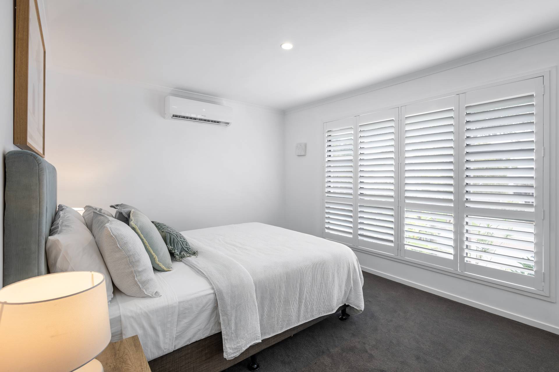 Upstairs offers another living area with televison and a couch that can be converted to a sofa bed if required.  The main bedroom upstairs has a King bed, television, built-in cupboards, air-conditioner, private balcony and en-suite bathroom with shower, vanity and toilet. The second bedroom has a Queen bed, television, built-in cupboards and air-conditioner, and the 3rd bedroom has two king single beds that can be converted to a king bed, built-in cupboards and air-conditioner.  The main bathroom has vanity, bath and shower, and there is a separate toilet adjacent.