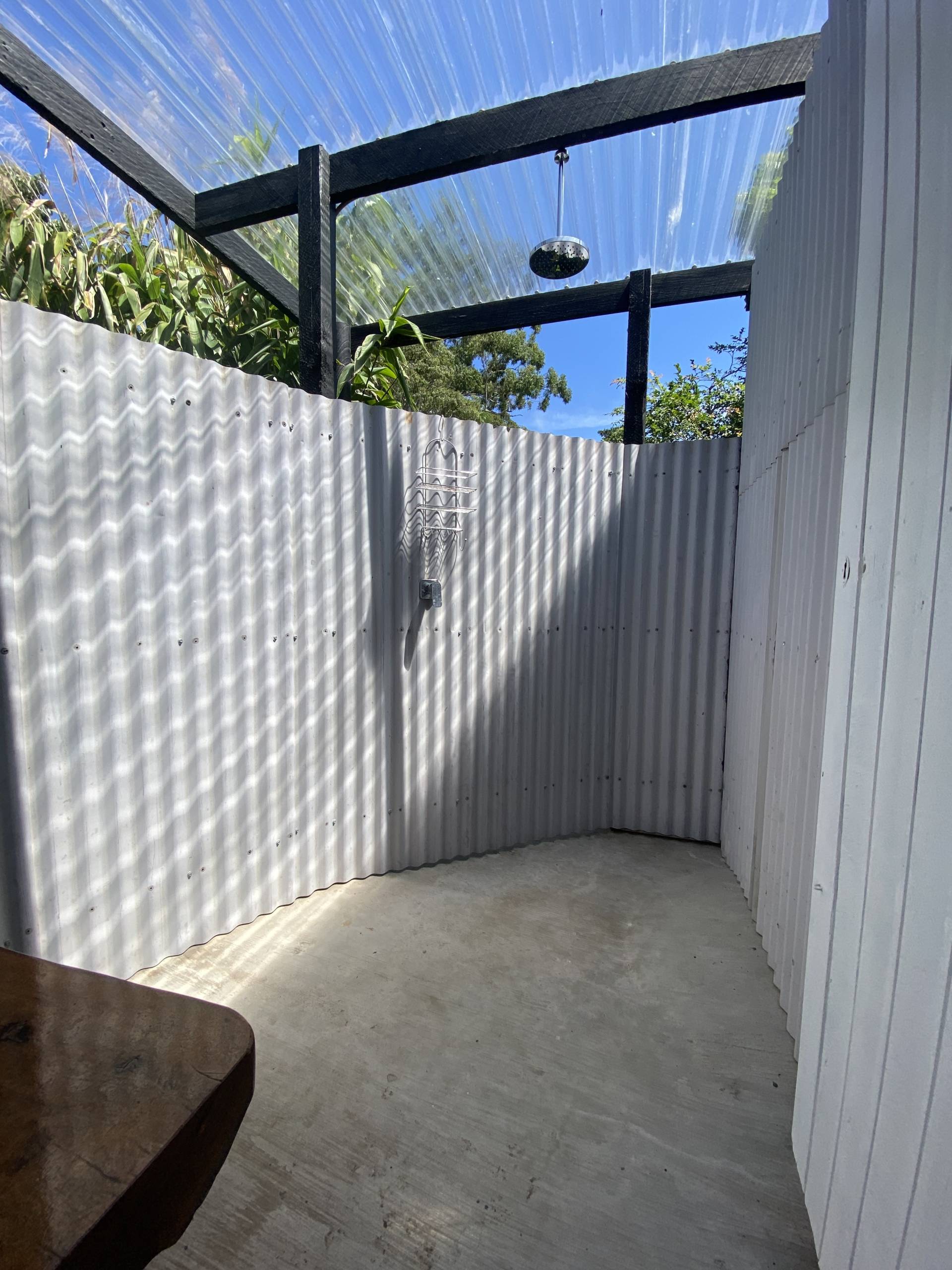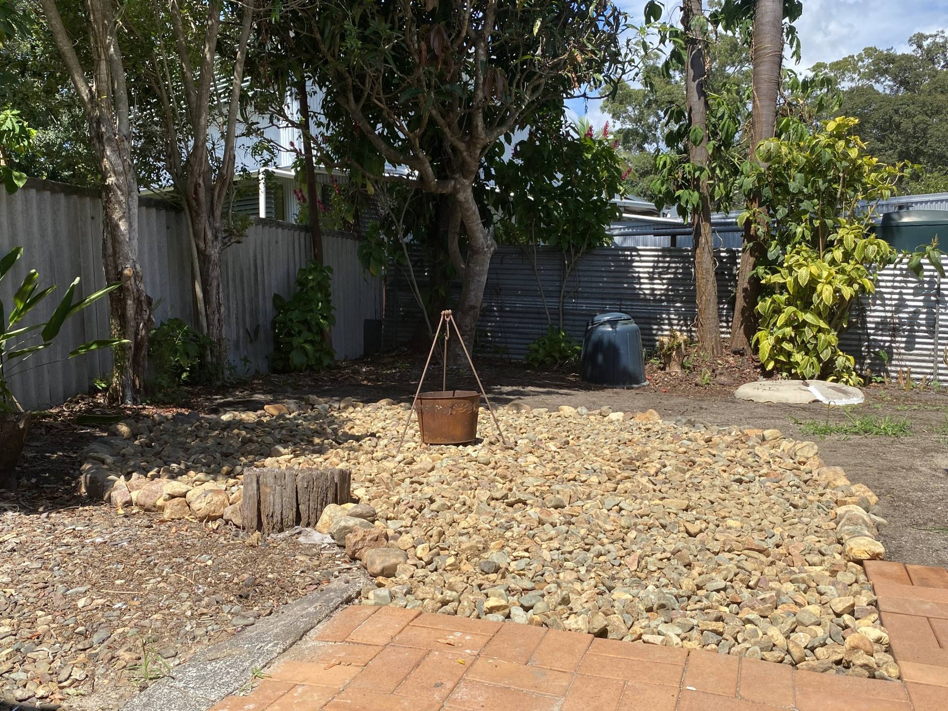 The bathroom with bath and shower is inside, with the toilet and laundry being just outside under cover of the rear roof. There are two covered patios - the front overlooking the gardens which have an abundance of fruit trees - and a butternut pumpkin vine starting to produce. The rear covered patio overlooks the stone fire pit area and back garden, and has a handy outdoor shower.