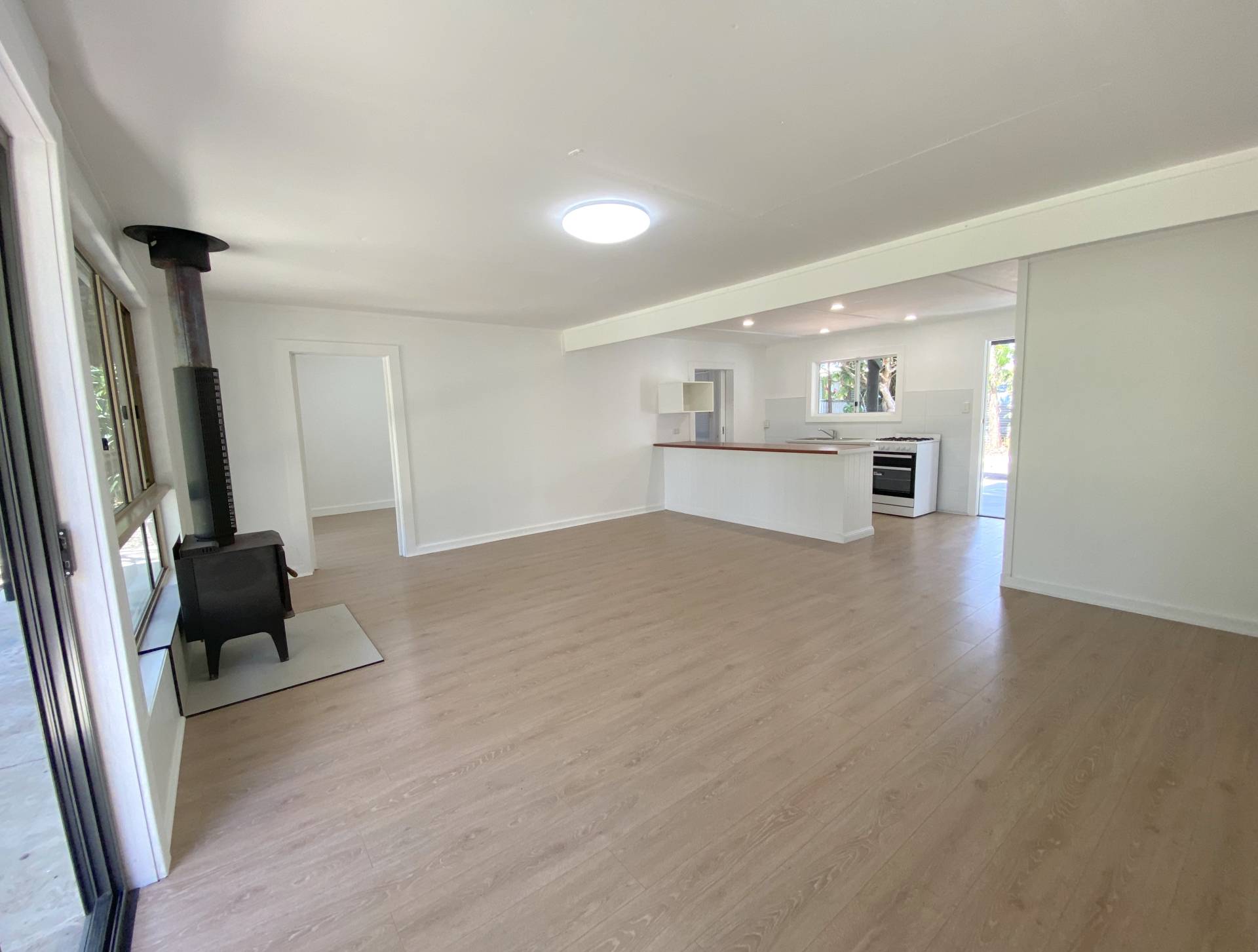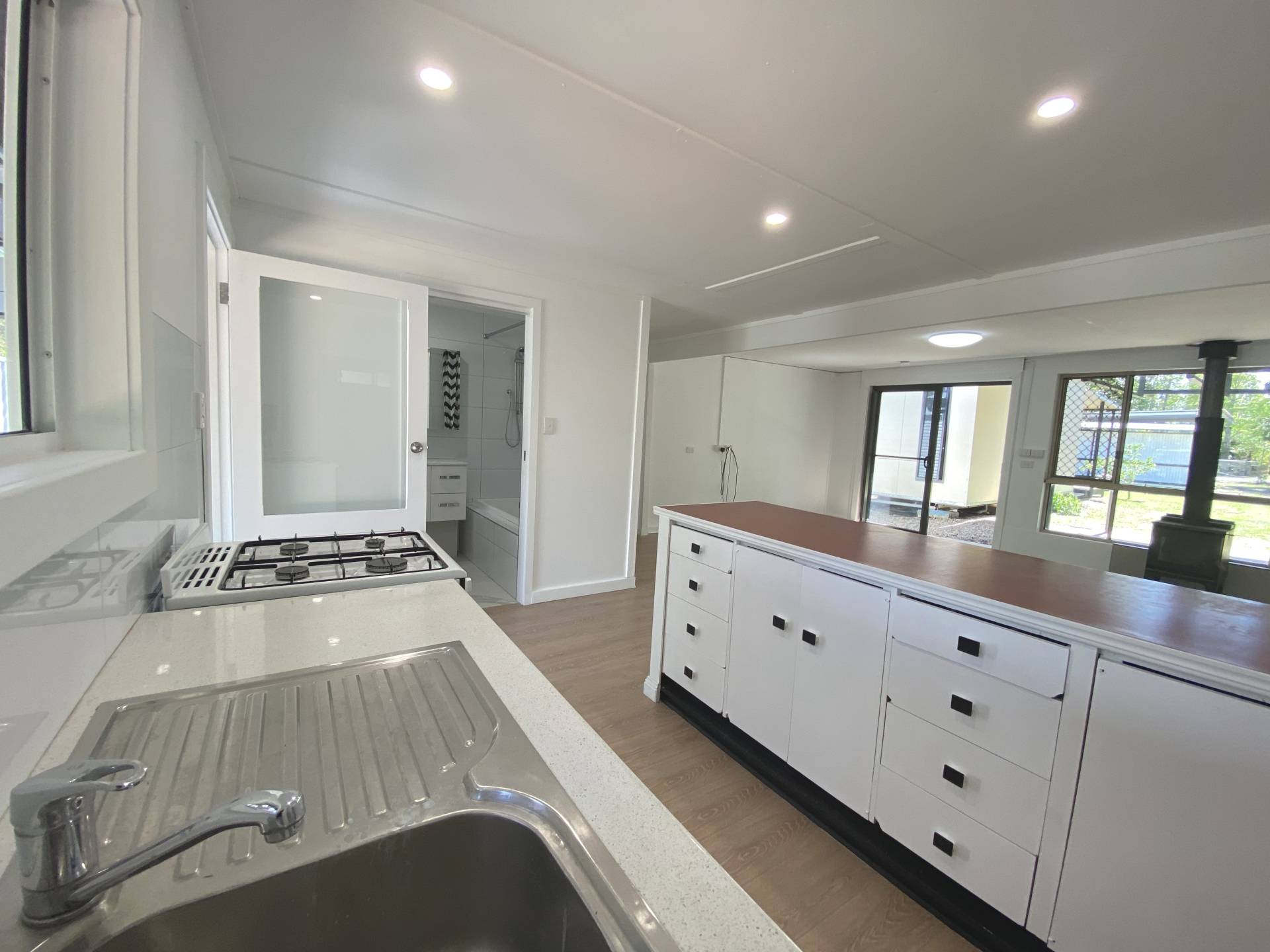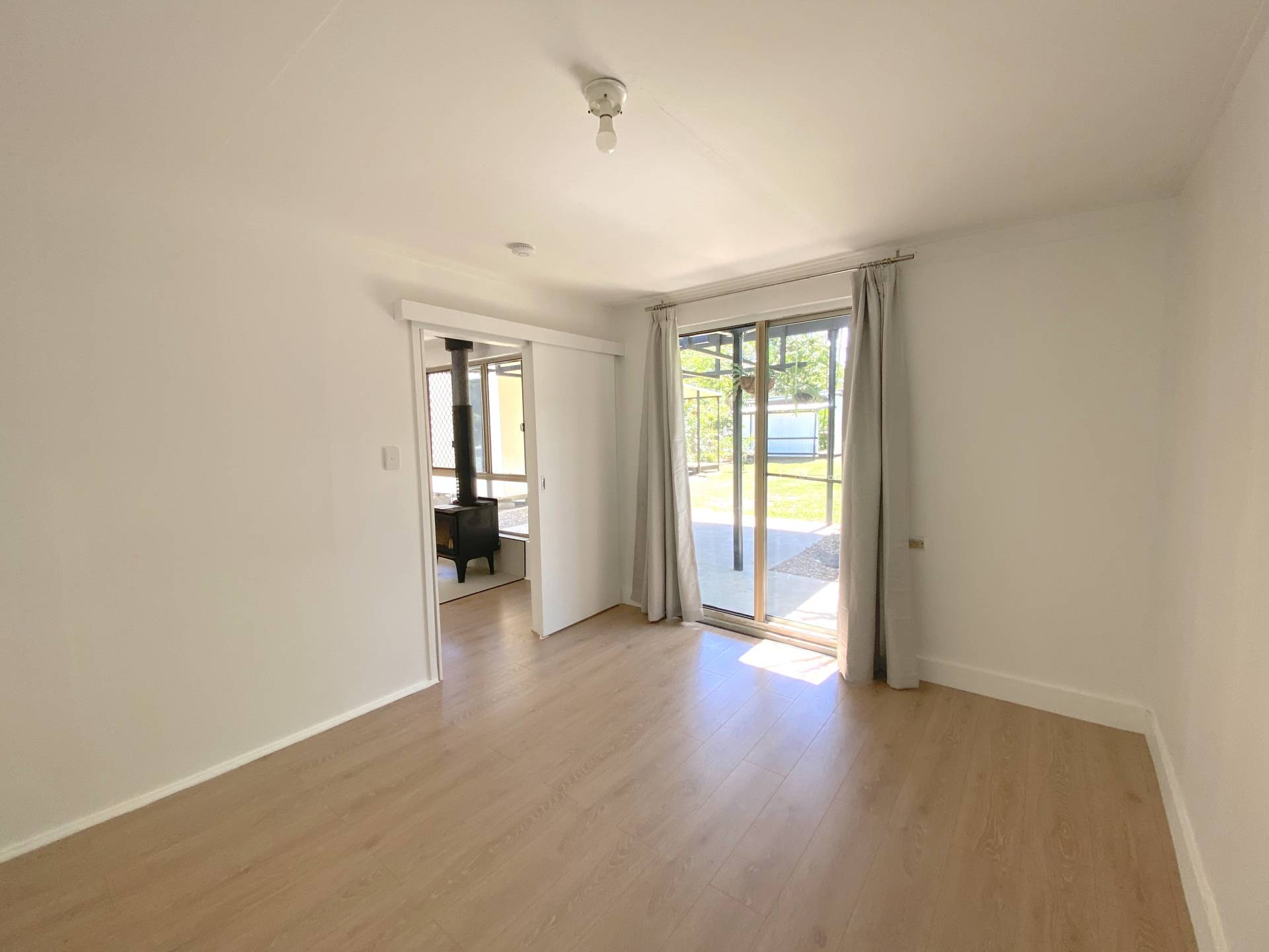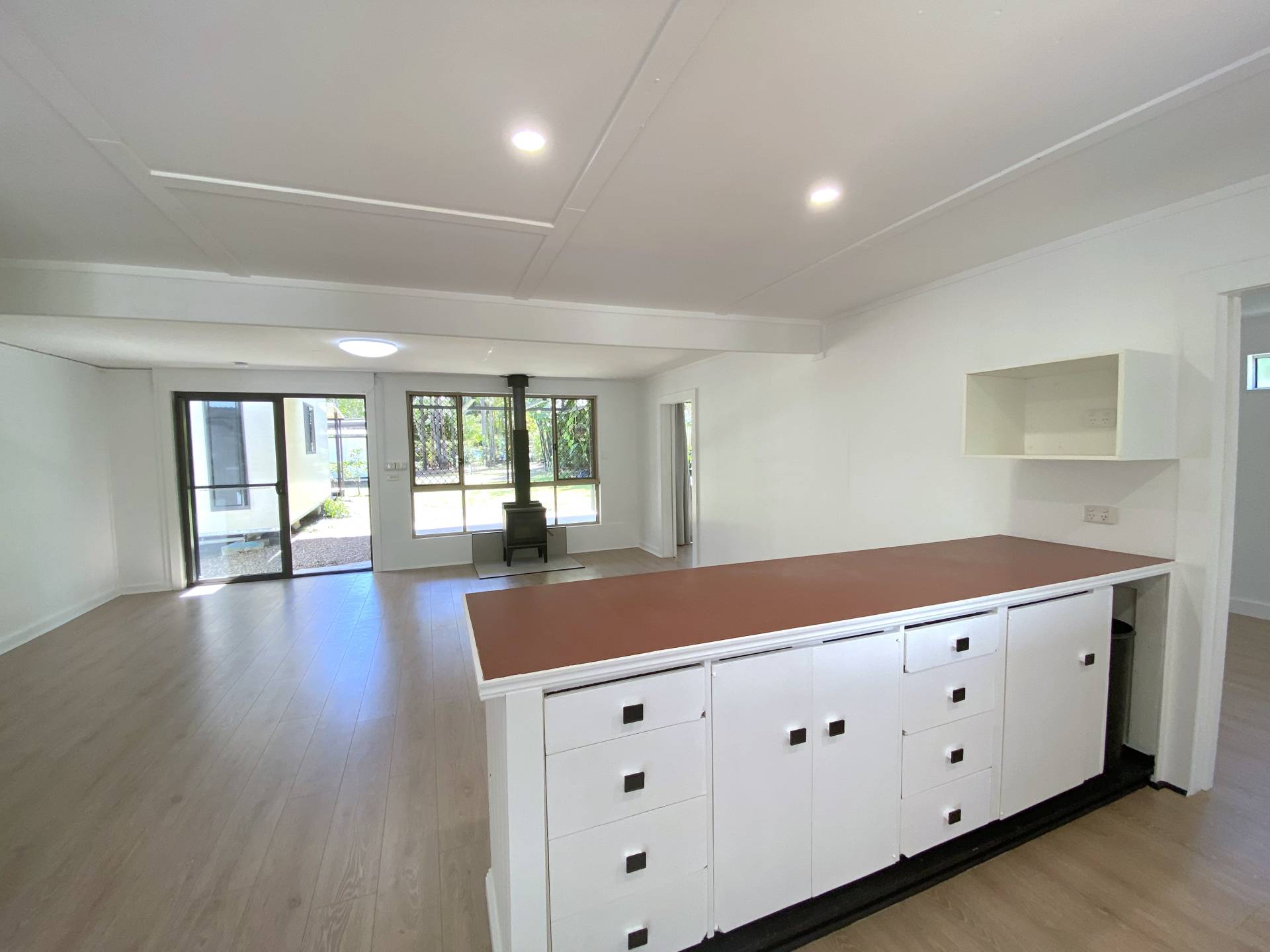 The main home has a lovely and bright open plan living complete with wood burning fire for the cooler nights and air-conditioning to help in summer. Kitchen with good bench space, storage and a gas free-standing oven and stove. 3 bedrooms, 1 with large built-in cupboards, and 2 having access out to the front or the rear patio. Tones are neutral throughout with lots of natural light, screens for cross breezes and easy care plank flooring.