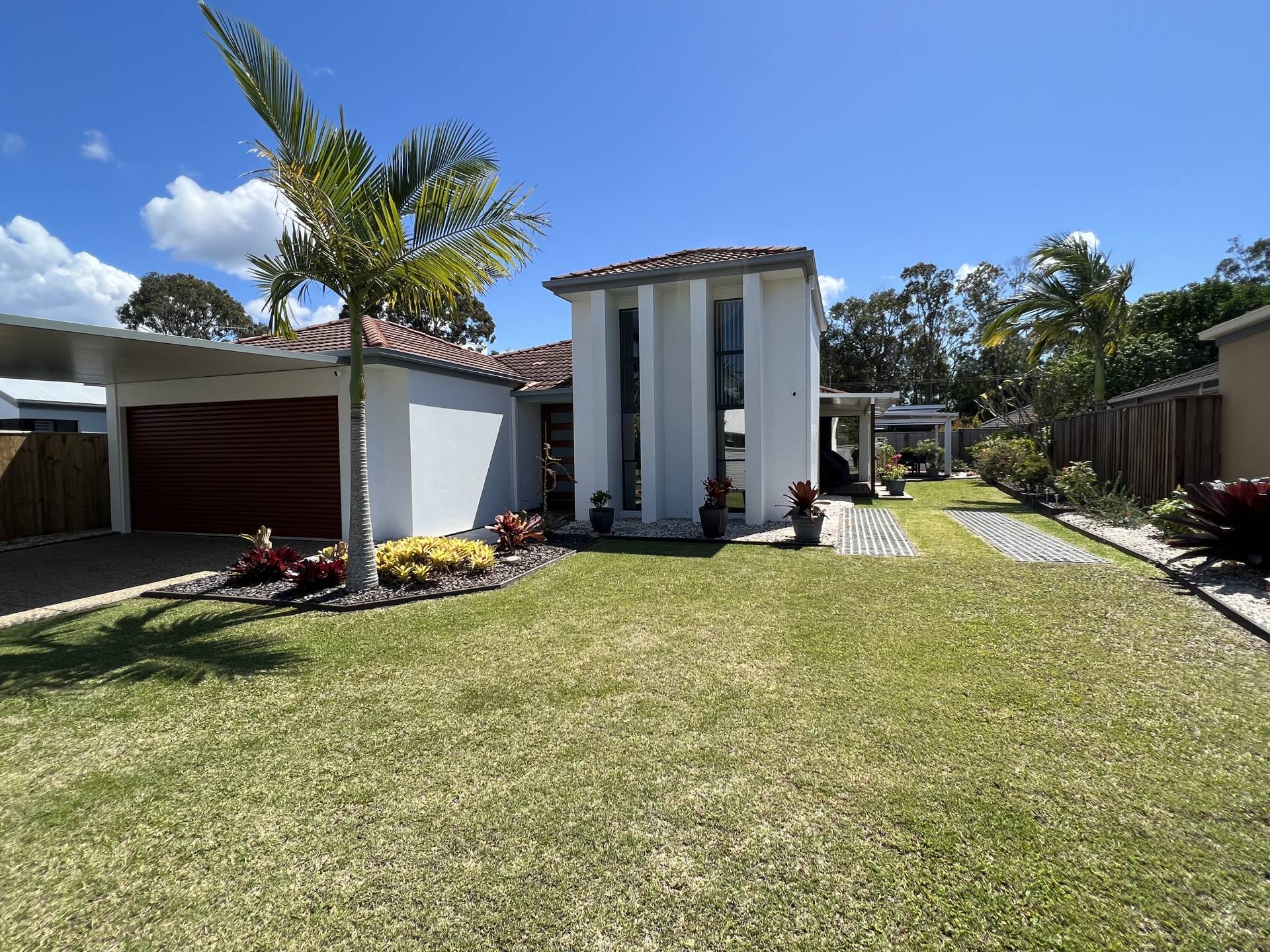 The gardens are low maintenance landscaping, and there is a garden shed for storage.  Double carport is available for parking inside the remote controlled gate.
