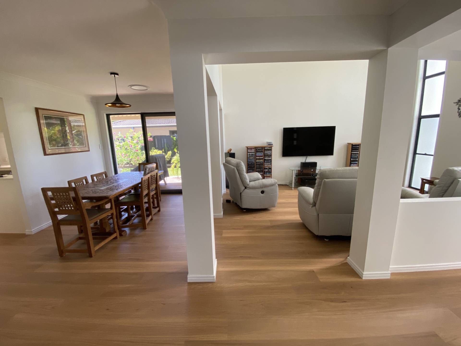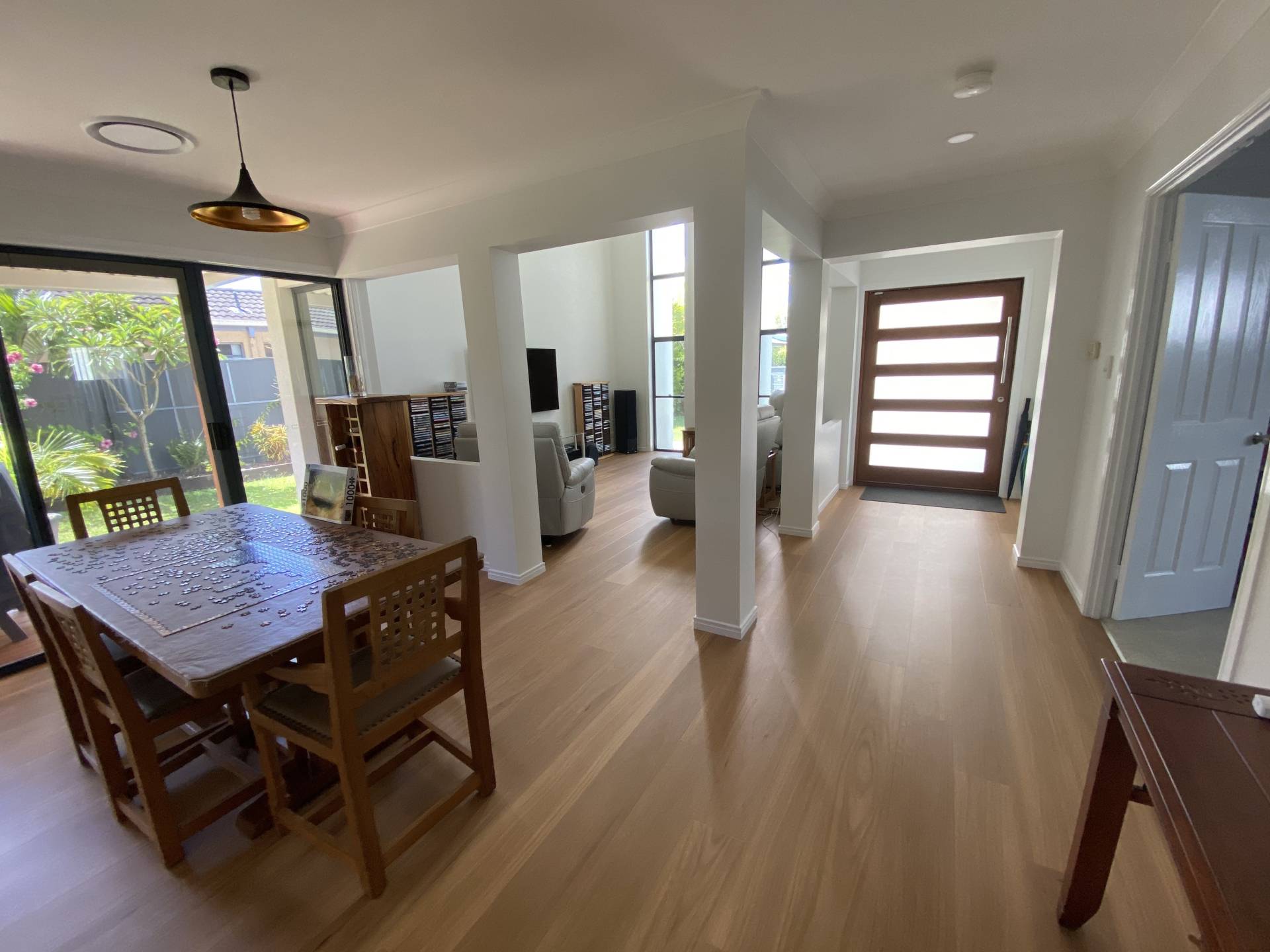 The home is single level and offers 2 separate living areas – one at the front of the home with spacious high ceilings, and one at the rear of the home which opens out to the covered patios on either side. The living areas are light and bright, with warm timber flooring throughout. The kitchen is the central hub of the home with plenty of bench space and storage, and there is a formal dining area between the kitchen and the front living room. There are sliding doors from the dining room that open out to the covered deck at the side which is the perfect space to relax and have a cuppa or glass of vino.